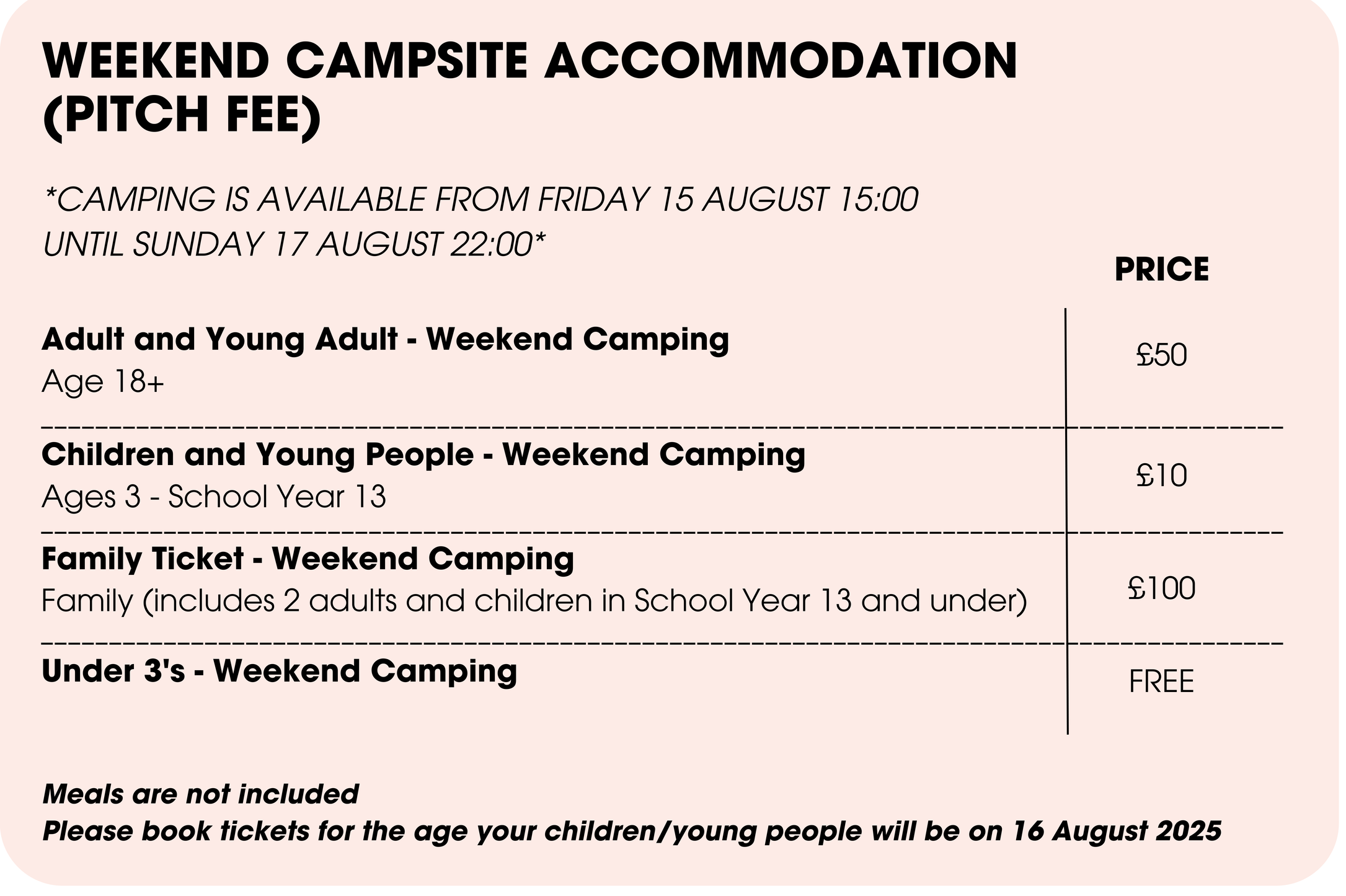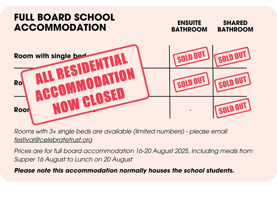 In order to make this event as affordable as possible, we have kept prices as low as we can. Although tickets and accommodation alone will not pay for the festival, our hope and prayer is that many will feel called to support us. Please prayerfully consider the option to donate towards the festival on booking. Thank you!
